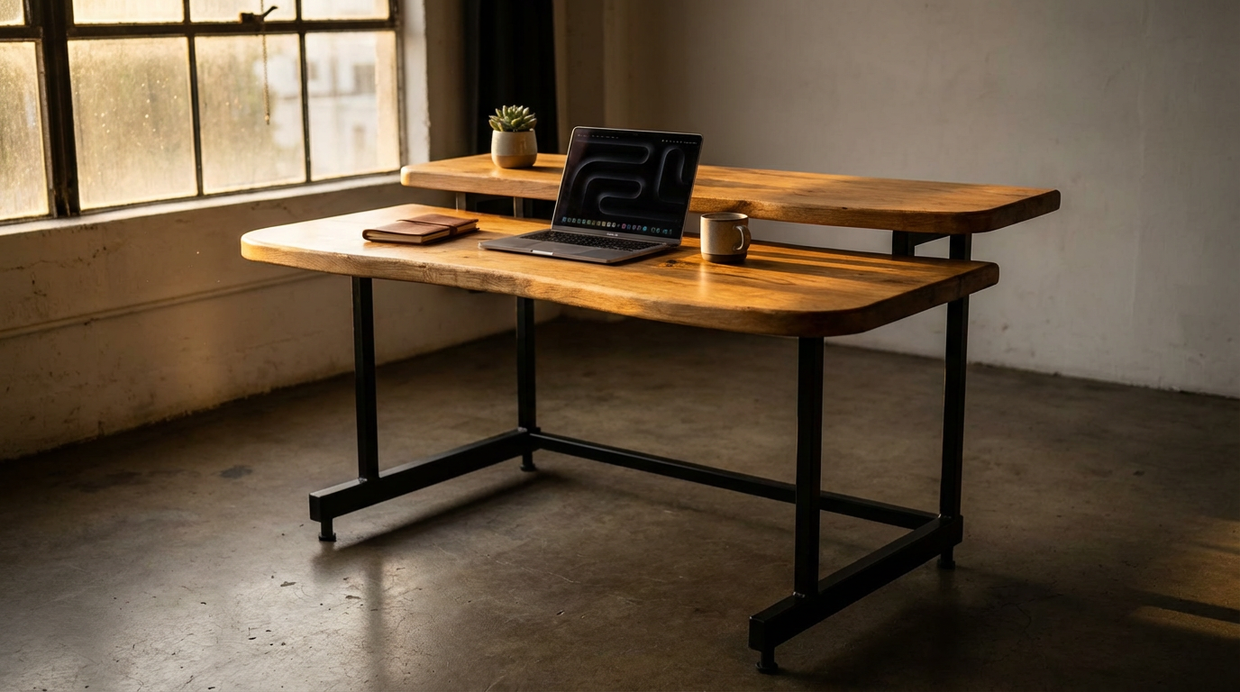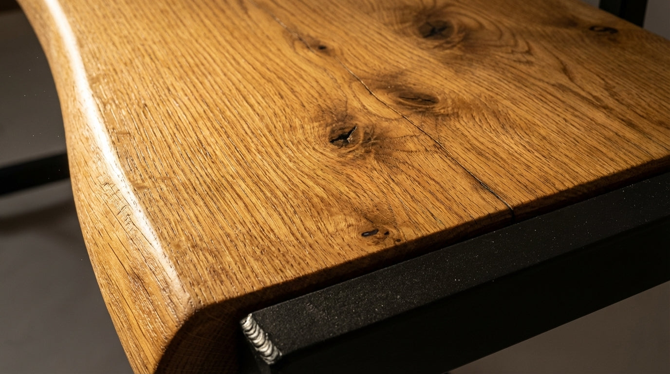 WUUD est né d'une passion simple : transformer la matière brute en objet durable. Chaque bureau est fabriqué à la main, en France, à partir de chêne massif brut et d'acier soudé. Aucune pièce ne se ressemble.
